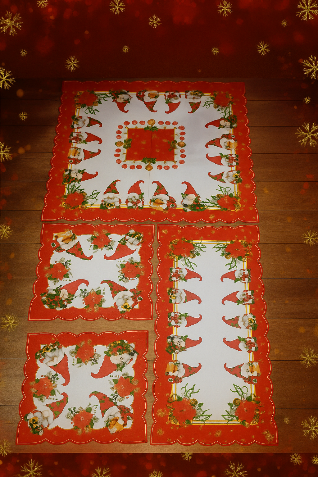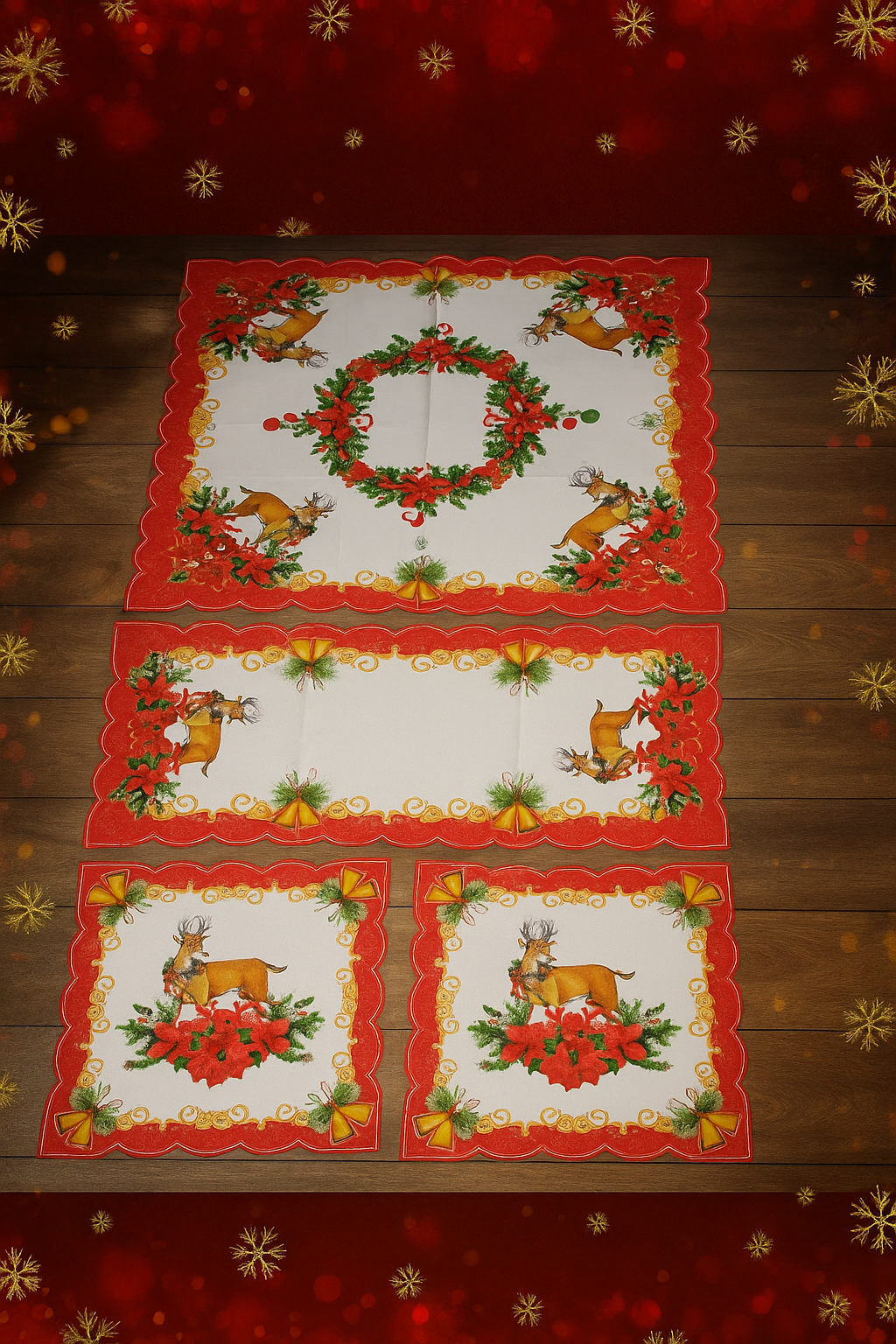 Με λεπτομέρειες υψηλής ποιότητας, ανθεκτικά υφάσματα και καλαίσθητα χρώματα, το σετ προσθέτει μοναδική φινέτσα σε τραπεζάκια, μπουφέδες, κομοδίνα και οποιοδήποτε σημείο χρειάζεται μια γιορτινή πινελιά.