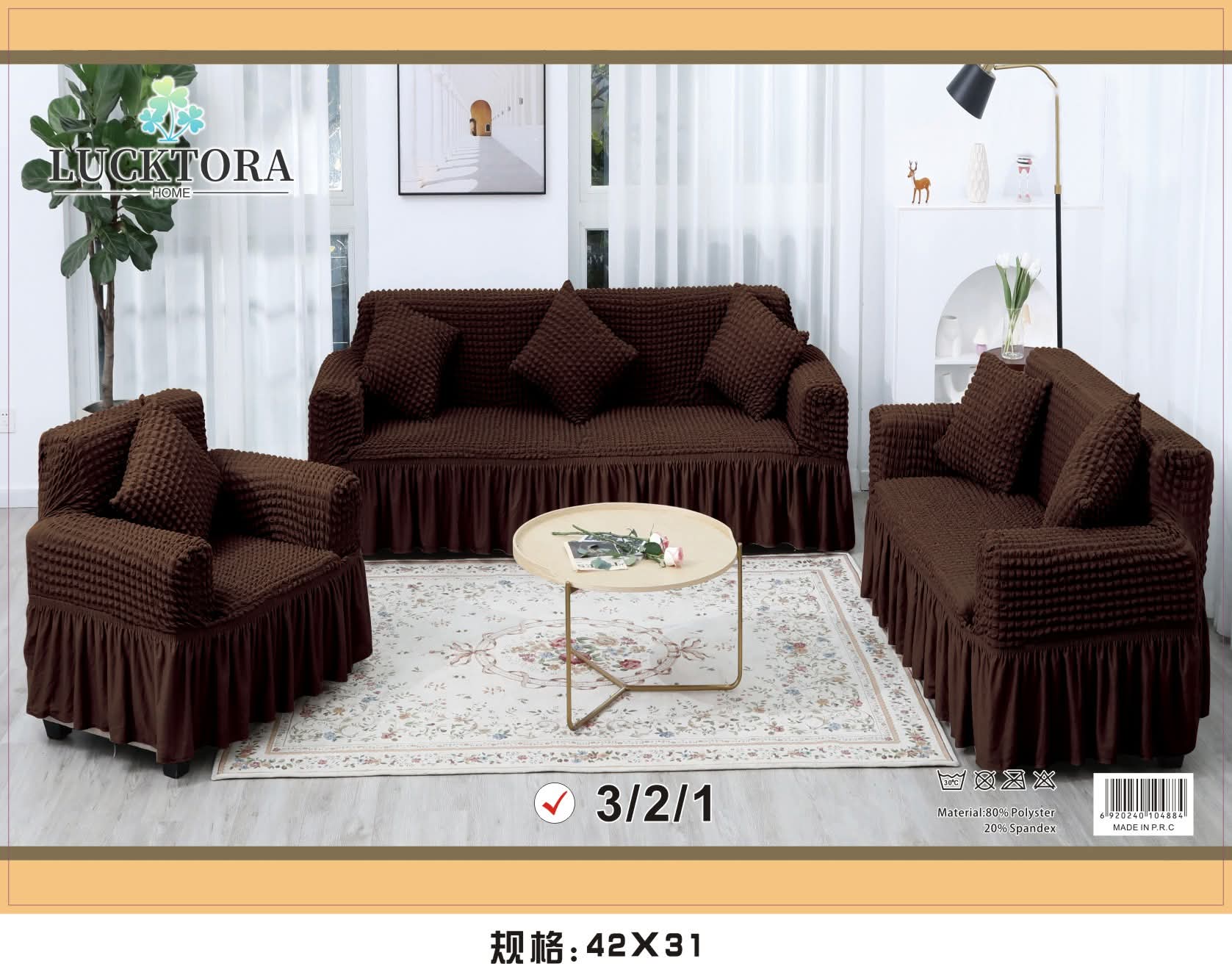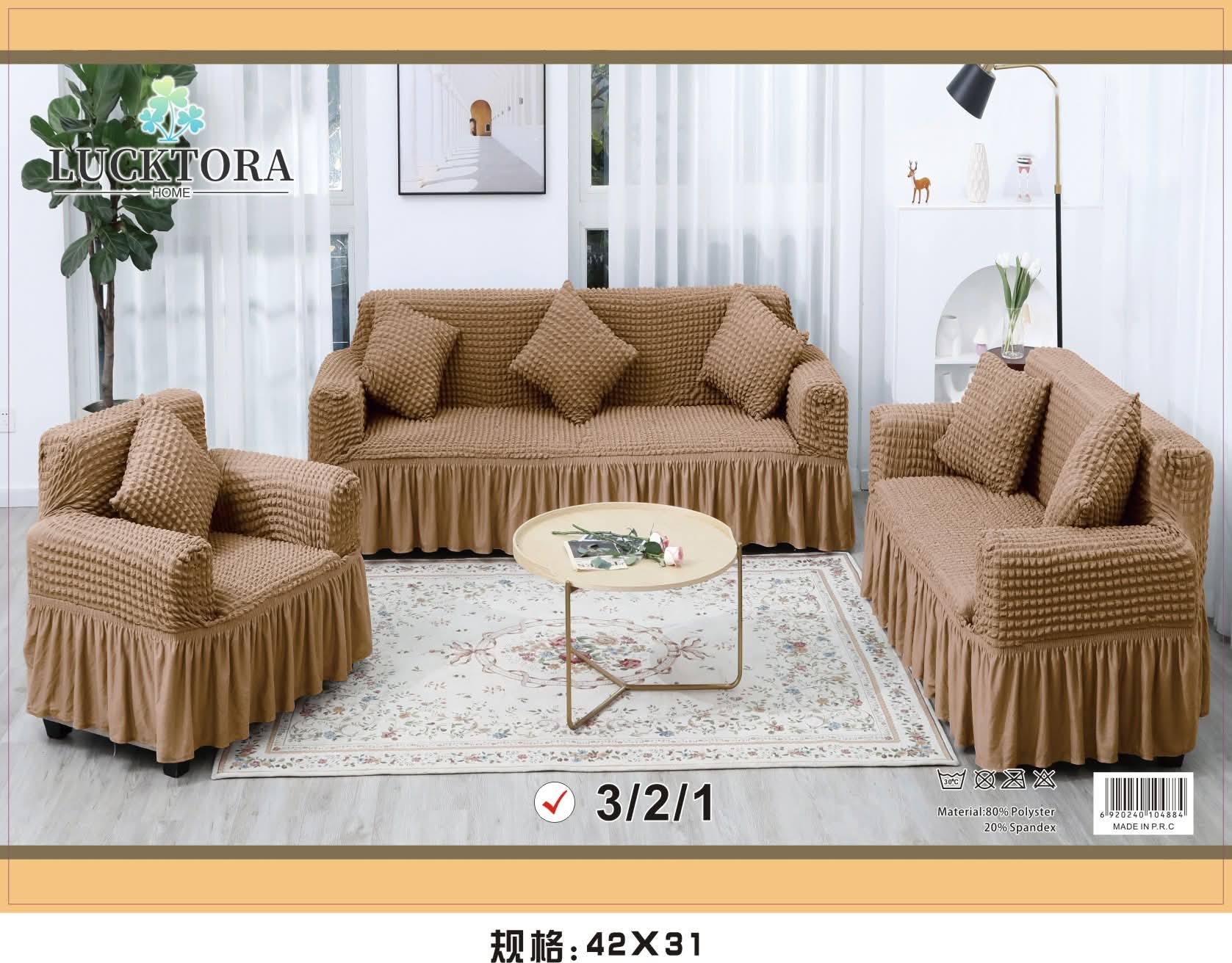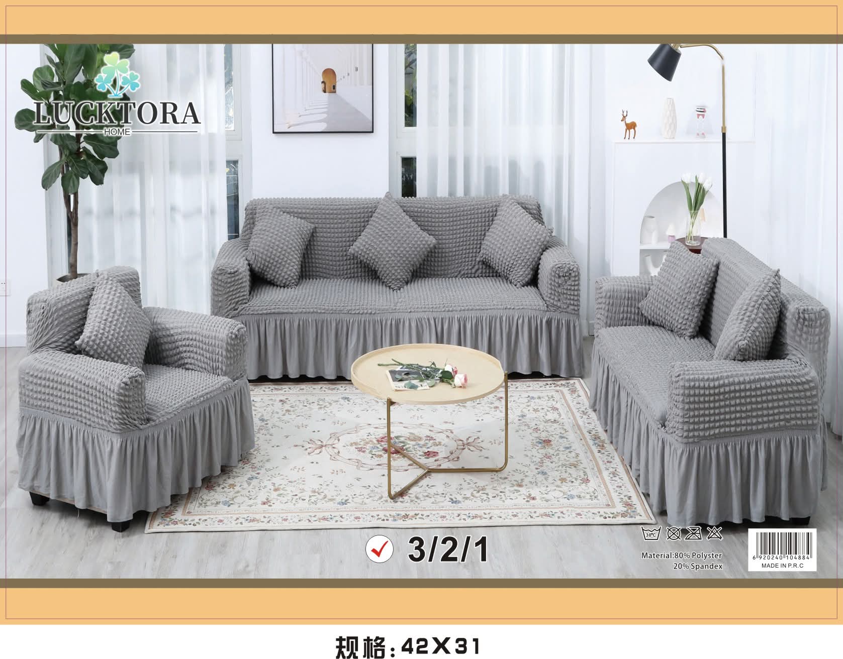 Σετ σαλονιού με ελαστικά καλύμματα που περιλαμβάνει πολυθρόνα, διθέσιο και τριθέσιο καναπέ. Κατασκευασμένα από υψηλής ποιότητας ύφασμα (80% Polyester, 20% Spandex), προσφέρουν τέλεια εφαρμογή, προστασία και ανανέωση στο σαλόνι σας. Εύκολα στο πλύσιμο και ιδανικά για καθημερινή χρήση.